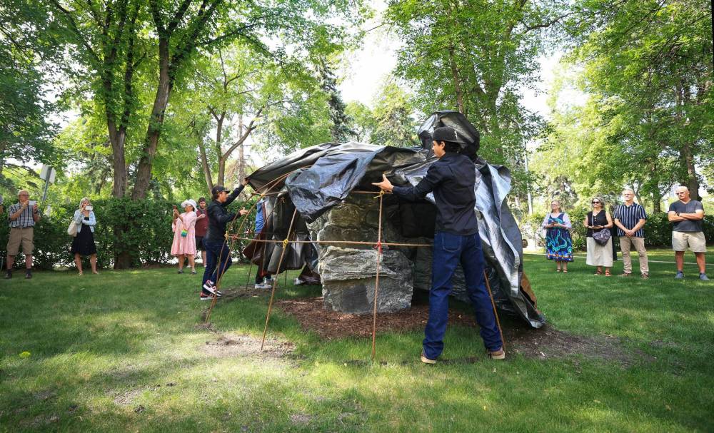 LeGatt reached out to Clayton Sandy, an elder from the Sioux Valley Dakota First Nation, to find a way to acknowledge its significance. They came up with an idea to surround it with a symbolic sweat lodge, since heated rocks are a crucial part of those healing ceremonies.