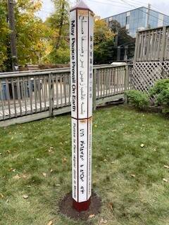The peace pole contains the message “may peace prevail on Earth” in 12 languages, including American Sign Language, Cree, English, French, Hebrew, Farsi, Mandarin, Michif, Swahili, Tagalog, Ukrainian and Urdu.