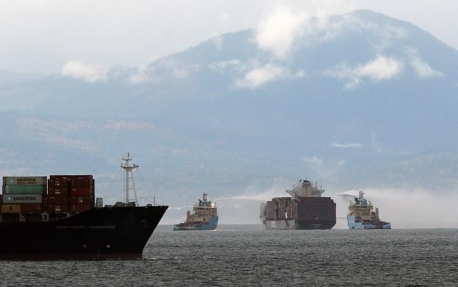 The coast guard said it received word late Saturday morning about a fire in 10 damaged containers aboard the vessel, which was anchored in Constance Bank, B.C.