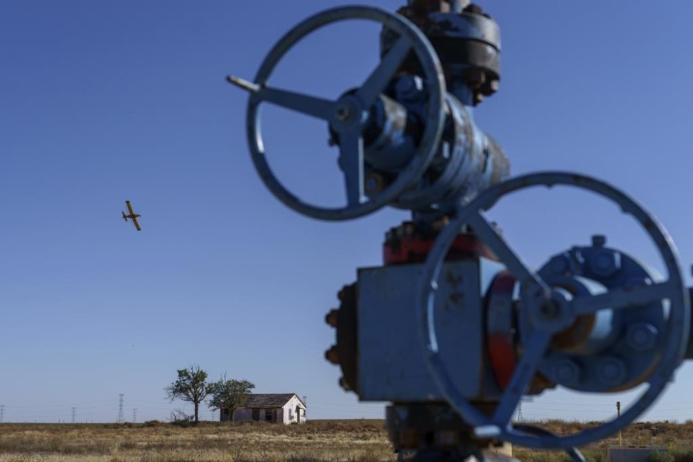 A crop dusting plane flies over a field next to an oil well in the Permian Basin in Lenorah, Texas, Friday, Oct. 15, 2021. Methane emissions are notoriously hard to track because they are intermittent. An old well may be wafting methane one day, but not the next. (AP Photo/David Goldman)