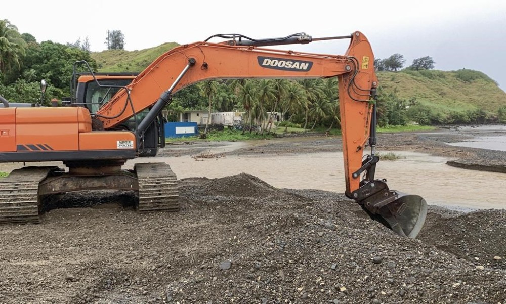 An excavator operator constructs a double berm along the shoreline of the Umatac Bay, near the mouth on the Laelae River, Guam as part as storm mitigation measures as Typhoon Mawar approaches the region Tuesday, May 23, 2023. (Rick Cruz/The Pacific Daily via AP)
