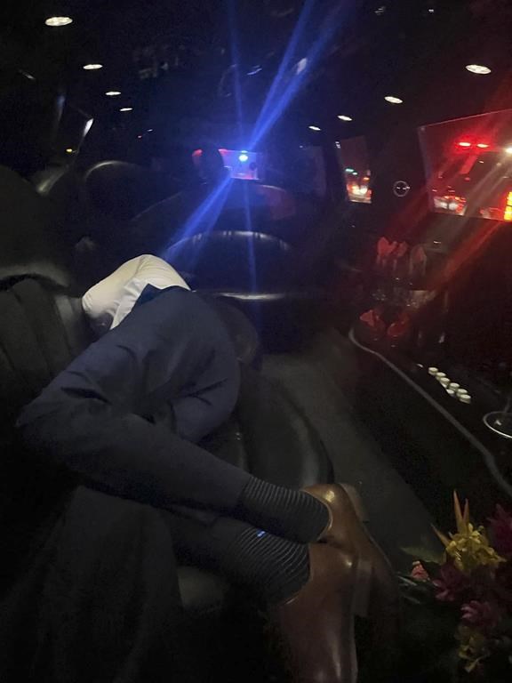 This early Wednesday, Aug. 9, 2023, photo provided by Cindy Curler shows Cindy and her husband Bob Curler laying in a limousine after their wedding in Lahaina on Maui, Hawaii. The Pittsburgh couple were unable to get back to their Lahaina hotel Tuesday on their wedding night as wildfires swallowed the town. Their driver was forced to take them to the garage where he parks his limousine. The newlyweds shared a couch for the night, her in her strapless lace gown, him in his crisp blue suit. (Courtesy of Cindy Curler via AP)