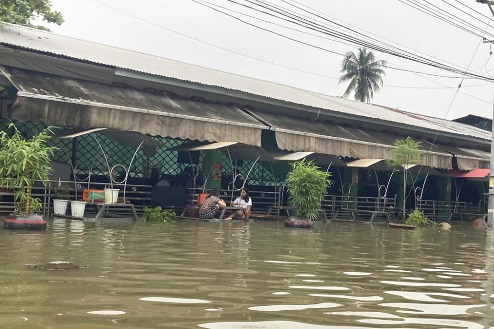 Two girls have foods at a restaurant on a flooded road in Bago, about 80 kilometers (50 miles) northeast of Yangon, Myanmar, Monday, Oct.9, 2023. Flooding triggered by heavy monsoon rains in Myanmar’s southern areas has displaced more than 10,000 people and disrupted traffic on the rail lines that connect the country’s biggest cities, officials and state-run media said Monday. (AP Photo/Thein Zaw)