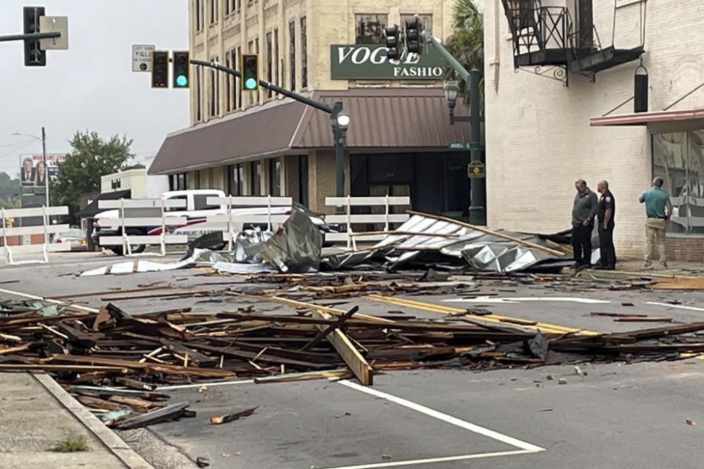 In Orangeburg, South Carolina, straight-line winds caused damage in the city’s downtown district, blowing down metal from roofs and wood from awnings of downtown businesses. City officials said they were cleaning up.