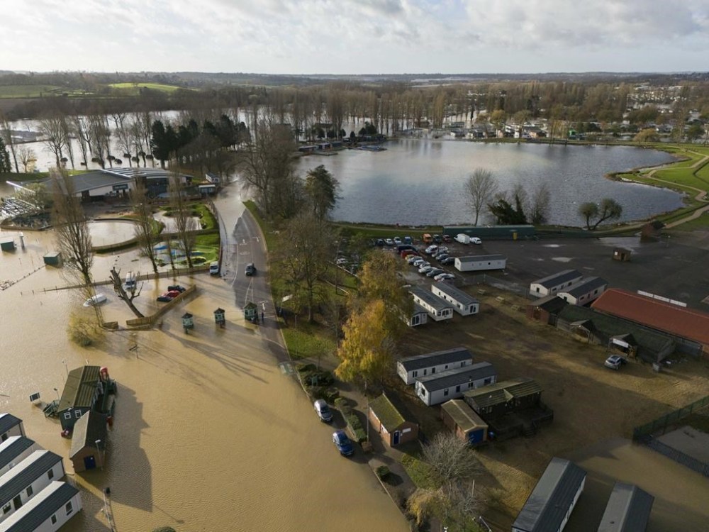 Floodwater covers parts of the Billing Aquadrome in Northamptonshire, England, Monday Nov. 25, 2024, after Storm Bert caused
