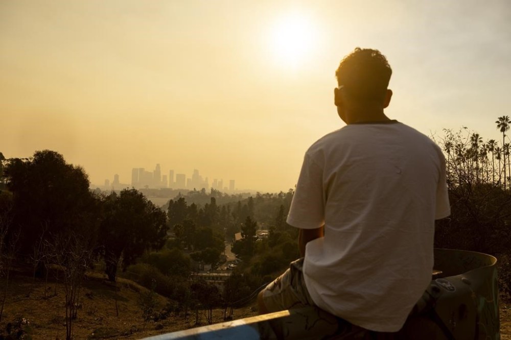 An inhabitant looks on as the sky is filled with smoke from multiple wildfires around the city skyline Thursday, Jan. 9, 2025, in Los Angeles, Calif. (AP Photo/Etienne Laurent)
