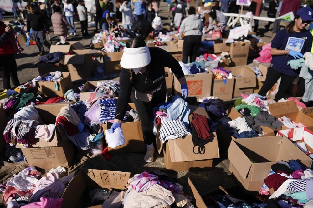 A person sifts through items at an aid center for people affected by wildfires at Santa Anita Park Monday, Jan. 13, 2025, in Arcadia, Calif. (AP Photo/Carolyn Kaster)