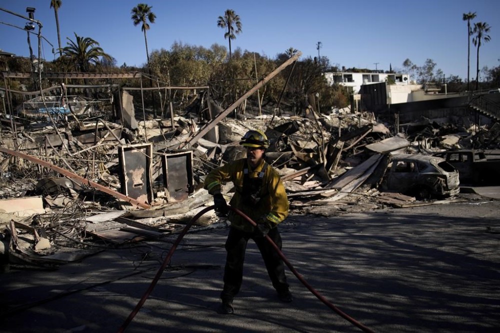 Tim Murphy, with the San Francisco Fire Dept., extends a hose while putting out hotspots in a fire-ravaged zone in the aftermath of the Palisades Fire in the Pacific Palisades neighborhood of Los Angeles, Monday, Jan. 13, 2025. (AP Photo/John Locher)