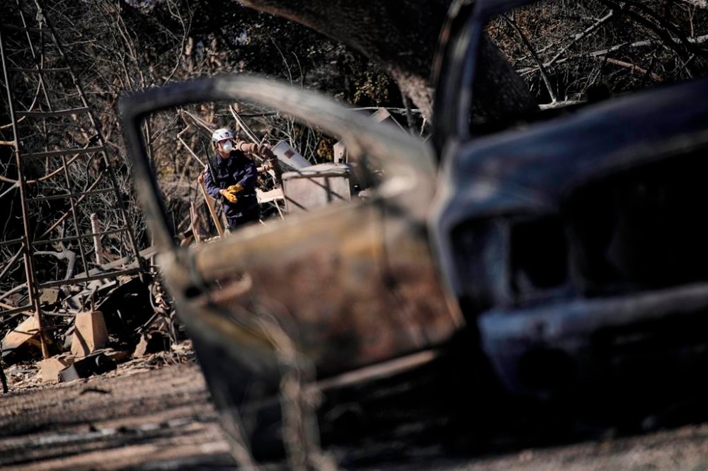 A search and rescue worker sifts through the wreckage of a home destroyed by the Eaton Fire, Tuesday, Jan. 14, 2025, in Altadena, Calif. (AP Photo/John Locher)