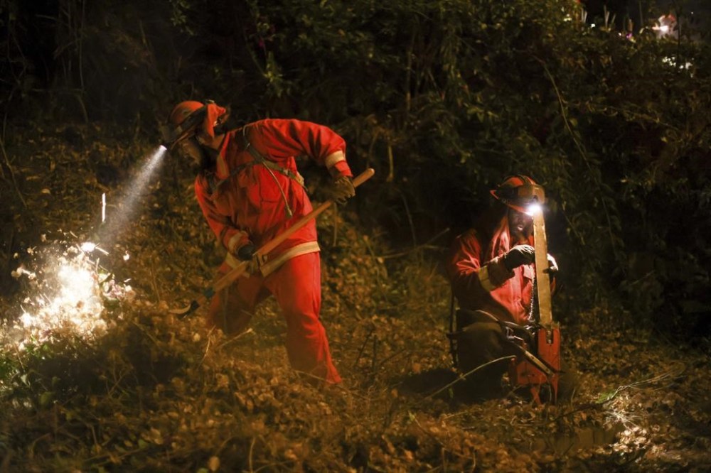 A California Department of Corrections hand crew works containment lines ahead of the Palisades Fire Tuesday, Jan. 14, 2025 in Santa Monica, Calif. (AP Photo/Ethan Swope)