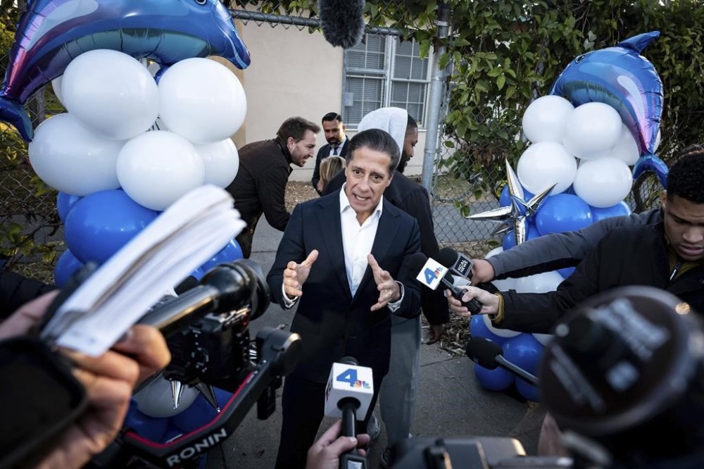 Superintendent of the Los Angeles Unified School District Alberto Carvalho speaks to the media at the first day back to school in a new location for children due to the wildfires from the Palisades Charter Elementary School which is now being held at the Brentwood Science Magnet in the Brentwood neighborhood of Los Angeles, Wednesday, Jan. 15, 2025. (David Crane/The Orange County Register via AP)