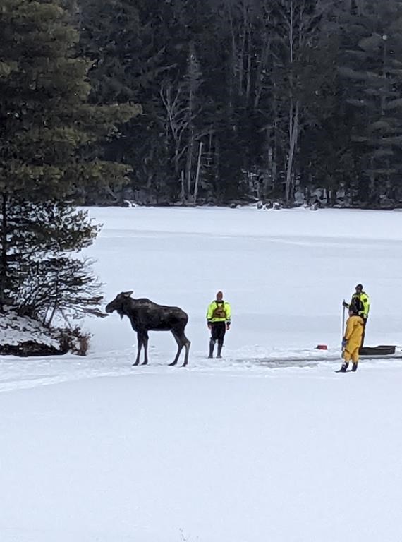 The moose fell through the ice around 11 a.m. Thursday, about 200 feet (60 meters) from shore on Lake Abanakee, the New York State Department of Environmental Conservation announced in a statement Friday. That lake is near the town of Indian Lake, about 60 miles (40 kilometers) south of Lake Placid and west of the Vermont border.
