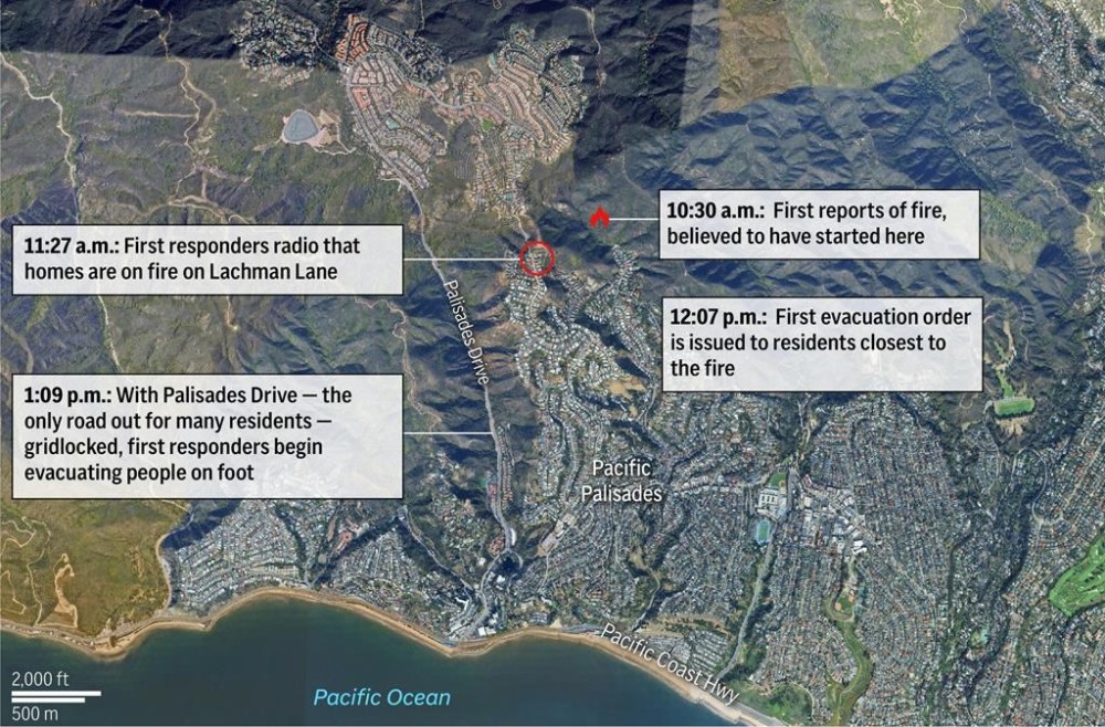The wildfire, which would become one of the most destructive in California history, was spreading rapidly in ornamental plantings and burning homes by 11:27 a.m. on Jan. 7, recordings of scanner traffic reveal. So many people fled on their own, as wind-whipped flames raced over the nearby hills, that by the time officials issued the order to evacuate at 12:07 p.m., traffic was gridlocked.
