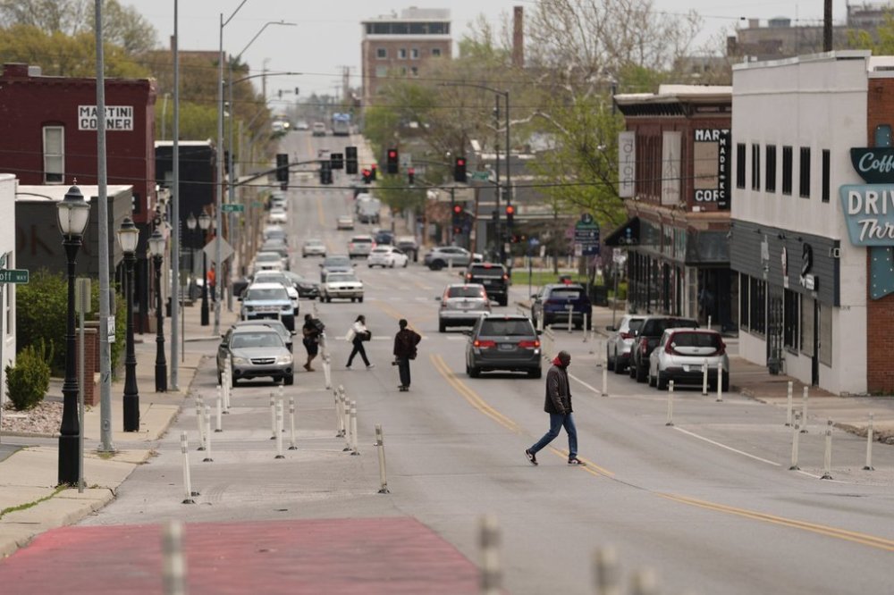 People cross 31st Street in Kansas City, Mo., where the city implemented a "road diet" reducing the street from four lanes to two in an effort to reduce speeding and accidents, Thursday, April 17, 2025. (AP Photo/Charlie Riedel)