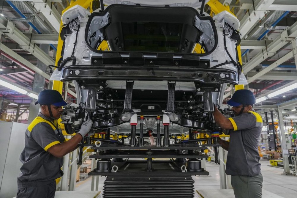 Workers assemble a car at the Vinfast electric vehicle plant in Thoothukudi, in the southern Indian state of Tamil Nadu, Monday, Aug. 4, 2025. (AP Photo/ Rafiq Maqbool)