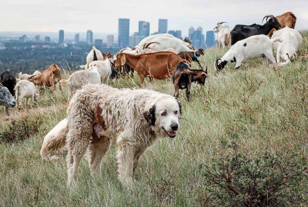Dot, a Pyrenean Mastiff, watches over a herd of goats as they eat grass and weeds in Nose Hill park in Calgary, on Wednesday, Aug. 13, 2025, as part of a project to help control vegetation growth. THE CANADIAN PRESS/Jeff McIntosh