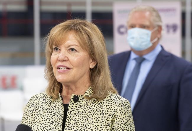 Ontario Health Minister Christine Elliott speaks during the daily briefing at a mass vaccination centre in Toronto on Tuesday, March 30, 2021. THE CANADIAN PRESS/Frank Gunn