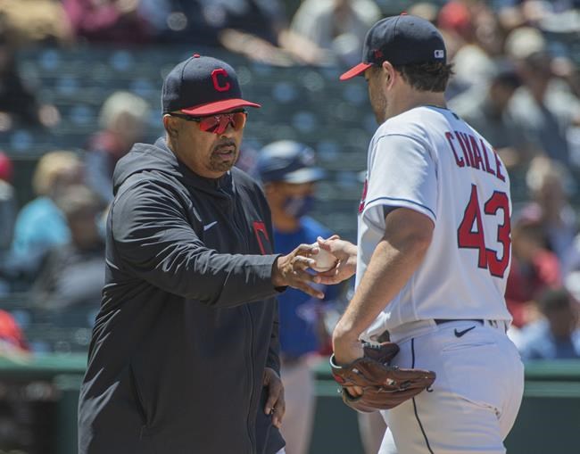 Cleveland Indians bench coach De Mario Hale, left, takes the ball from Aaron Civale during the seventh inning of the first baseball game of a doubleheader against the Toronto Blue Jays in Cleveland, Sunday, May 30, 2021. Hale is filling in for Indians manager Terry Francona. (AP Photo/Phil Long)