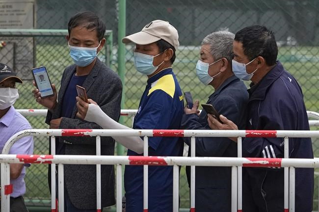 Residents wearing face masks to help curb the spread of the coronavirus look at their smartphones showing health code as they line up to receive the Sinopharm COVID-19 vaccine at a vaccination center in Central Business District in Beijing on Wednesday, June 2, 2021. After a slow start, China is now doing what virtually no other country in the world can: harnessing the power and all-encompassing reach of its one-party system and a maturing domestic vaccine industry to administer shots at a staggering pace. (AP Photo/Andy Wong)