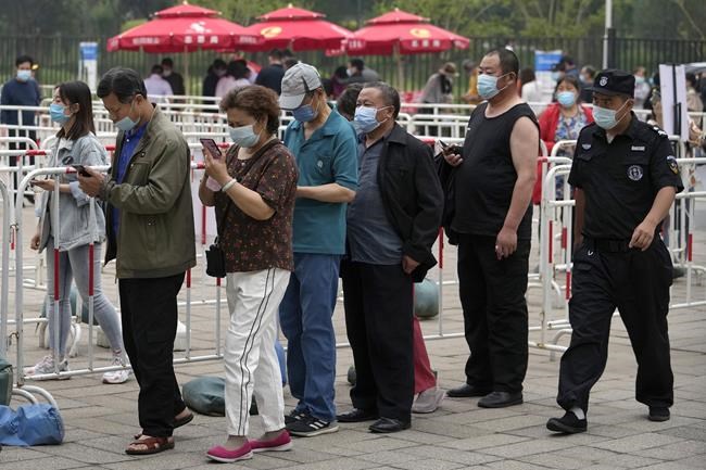A security guard watches residents wearing face masks to help curb the spread of the coronavirus line up to receive the Sinopharm COVID-19 vaccine at a vaccination center in the Central Business District in Beijing, Wednesday, June 2, 2021. After a slow start, China is now doing what virtually no other country in the world can: harnessing the power and all-encompassing reach of its one-party system and a maturing domestic vaccine industry to administer shots at a staggering pace. (AP Photo/Andy Wong)