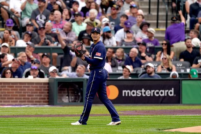 American League's starting pitcher Shohei Ohtani, of the Los Angeles Angeles, watches a fly out during the first inning of the MLB All-Star baseball game, Tuesday, July 13, 2021, in Denver. (AP Photo/Gabriel Christus)