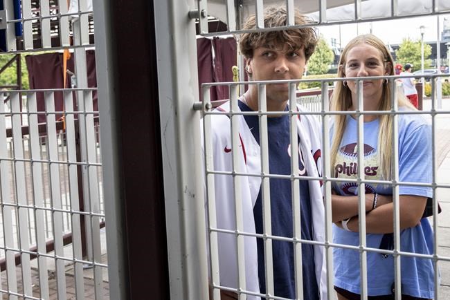 Fans stand outside a locked gate of Citizens Bank Park after the baseball game between the Philadelphia Phillies and Washington Nationals was suspended due to COVID-19 issues among the Nationals, Wednesday, July 28, 2021, in Philadelphia. (AP Photo/Laurence Kesterson)