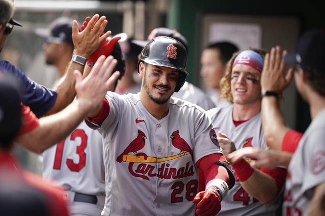 St. Louis Cardinals' third baseman Nolan Arenado (28) celebrates with teammates after hitting a home run during the ninth inning of a baseball game against the Cincinnati Reds in Cincinnati, Sunday, July 25, 2021. (AP Photo/Bryan Woolston)