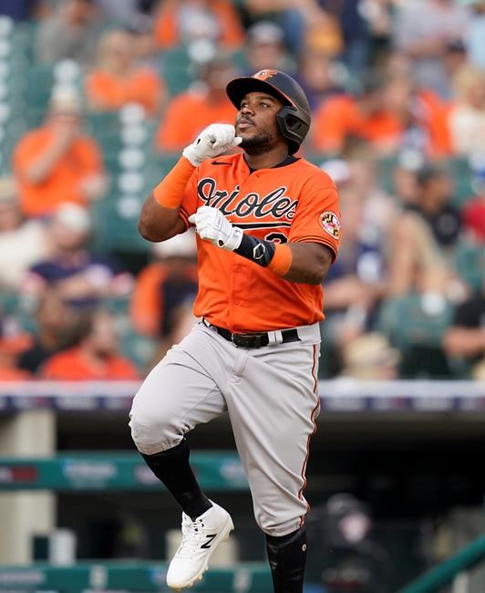 Baltimore Orioles' Maikel Franco rounds the bases after a solo home run during the fifth inning of a baseball game against the Detroit Tigers, Saturday, July 31, 2021, in Detroit. (AP Photo/Carlos Osorio)
