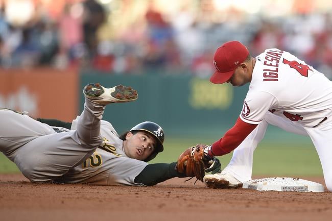 Los Angeles Angels shortstop Jose Iglesias, right, tags out Oakland Athletics' Ramon Laureano during the first inning of a baseball game in Anaheim, Calif., Thursday, July 29, 2021. (AP Photo/Kelvin Kuo)