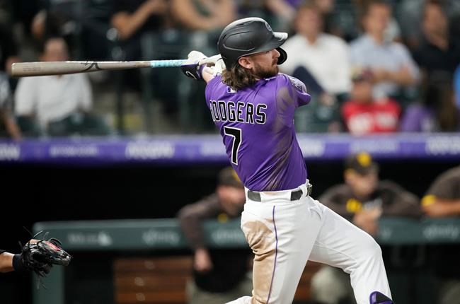Colorado Rockies' Brendan Rodgers follows the flight of his RBI-double off San Diego Padres relief pitcher Pierce Johnson in the fourth inning of a baseball game, Tuesday, Aug. 17, 2021, in Denver. (AP Photo/David Zalubowski)