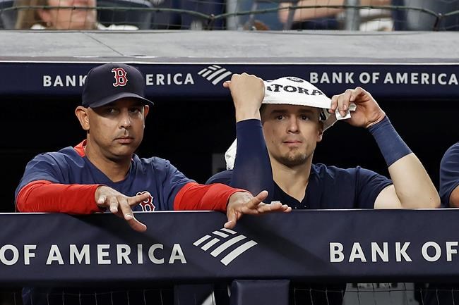 Boston Red Sox manager Alex Cora, left, and player Enrique Hernandez watch from the dugout during the fourth inning of the team's baseball game against the New York Yankees on Wednesday, Aug. 18, 2021, in New York. (AP Photo/Adam Hunger)