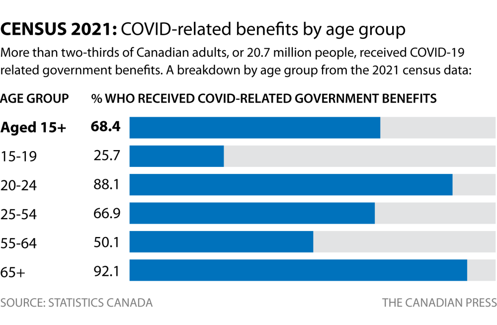 More than two-thirds of Canadian adults, or 68.4 per cent, received COVID-19 related government benefits, with 27.6 of adults receiving federal emergency and recovery benefits, most often CERB.