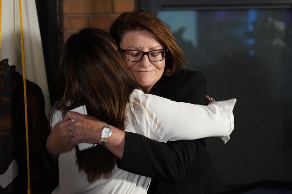 California state Senate President Pro Tempore Toni Atkins, right, hugs Jodie Hicks, chief executive officer and president of Planned Parenthood Affiliates of California, at a gathering in support of Proposition 1, in Sacramento, Calif., Tuesday, Nov. 8, 2022. Voters approved the measure that puts the right to an abortion in the California Constitution. (AP Photo/Rich Pedroncelli)