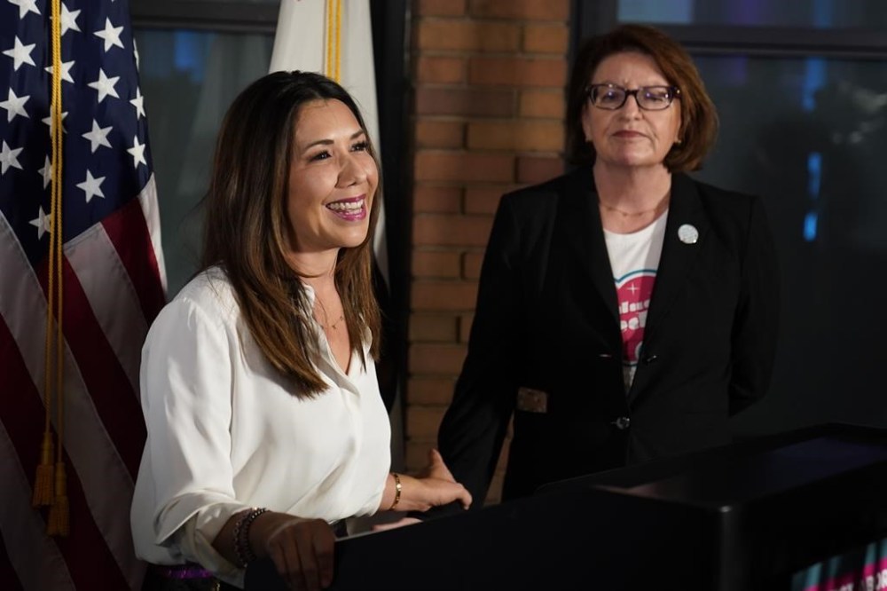 Jodie Hicks, chief executive officer and president of Planned Parenthood Affiliates of California, left, speaks to reporters at a gathering in support of Proposition 1, in Sacramento, Calif., Tuesday, Nov. 8, 2022. Voters approved the measure that puts the right to an abortion in the California Constitution. At right is California state Senate President Pro Tempore Toni Atkins. (AP Photo/Rich Pedroncelli)