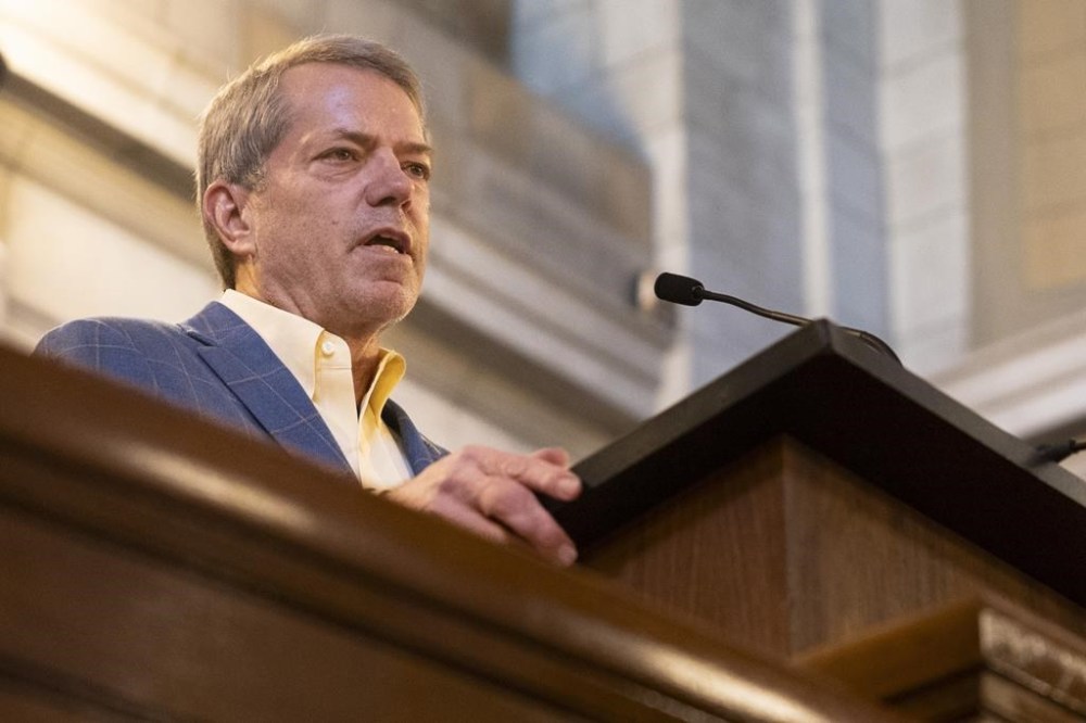 Gov. Jim Pillen announces that the state will participate in the Summer Electronic Benefits Transfer Program after previously saying Nebraska wouldn't take part during a press conference in the Warner Chamber at the Capitol, Monday, Feb. 12, 2024, in Lincoln, Neb. (Kenneth Ferriera/Lincoln Journal Star via AP)