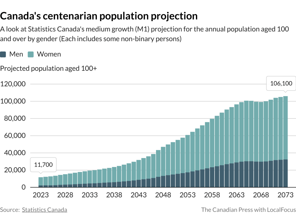 Statistics Canada data show the country’s population of people aged at least 100 more than tripled between 2000 and 2023, up from 3,393 to 11,705. That makes centenarians the fastest growing age group in Canada, and the agency says their numbers are poised to rise almost ten times higher over the next half-century.