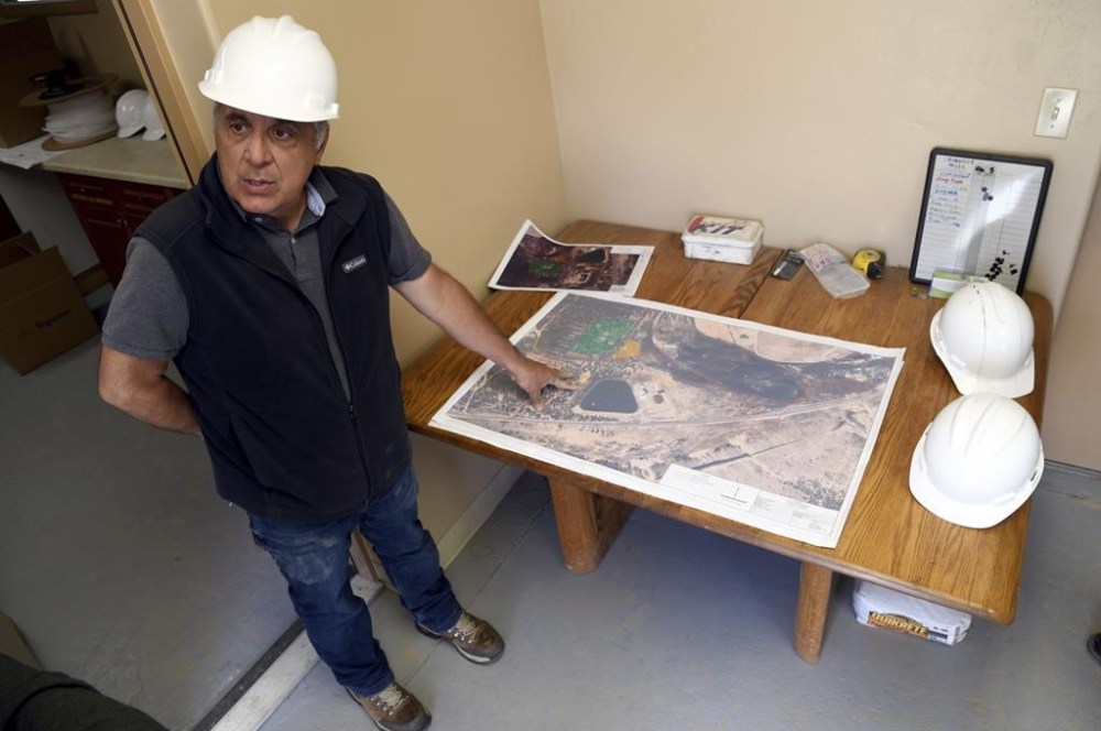 Nick Michael with CJK Milling discusses a project map at the company's mill in Leadville, Colo., on Thursday, June 27, 2024. (AP Photo/Thomas Peipert)