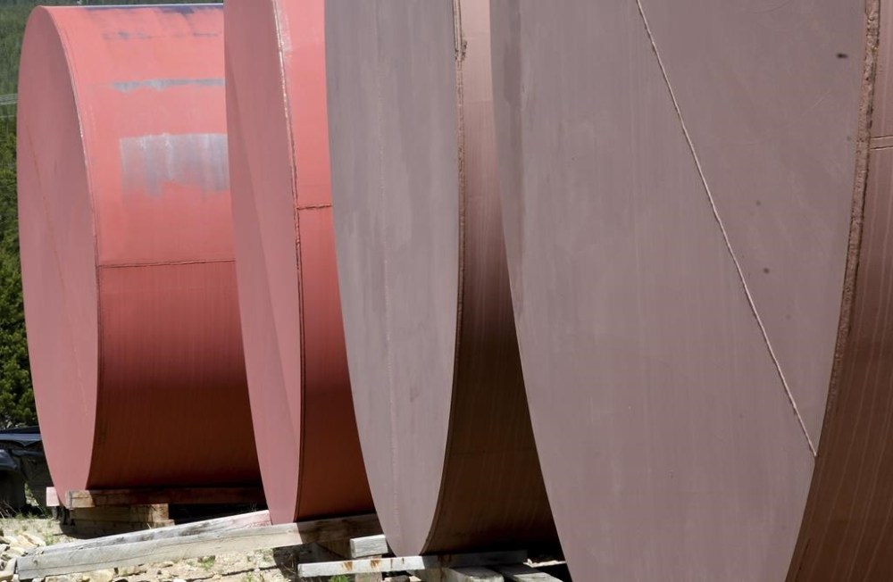 Empty cyanide tanks sit outside of a welding shop in Leadville, Colo., on Thursday, June 27, 2024. (AP Photo/Thomas Peipert)