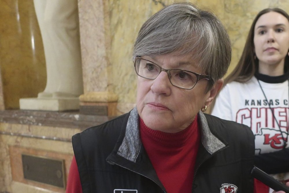 Kansas Gov. Laura Kelly speaks to reporters following a public event, Friday, Feb. 7, 2025, at the Statehouse in Topeka, Kansas. She has vetoed a bill that would ban gender-affirming care for transgender minors. (AP Photo/John Hanna)