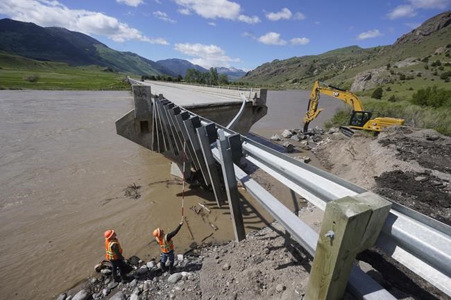 Highway workers inspect a washed out bridge along the Yellowstone River Wednesday, June 15, 2022, near Gardiner, Mont. Yellowstone National Park officials say more than 10,000 visitors have been ordered out of the nation's oldest national park after unprecedented flooding tore through its northern half, washing out bridges and roads and sweeping an employee bunkhouse miles downstream. (AP Photo/Rick Bowmer)