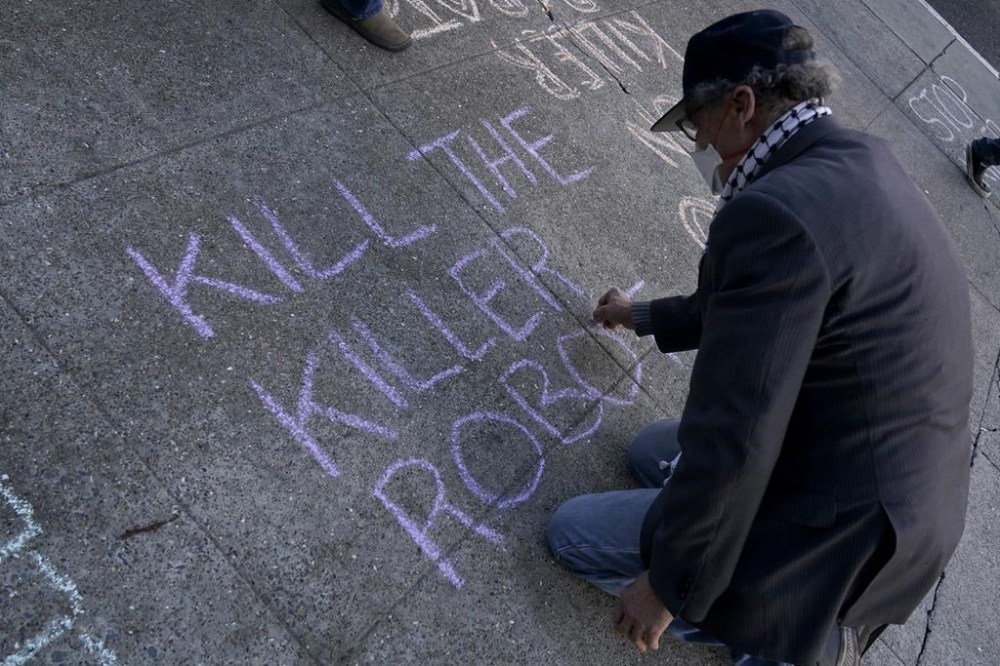 Three city supervisors who felt otherwise joined dozens of protestors outside City Hall on Monday, the day before the board is set to take a second and final vote on the policy. The demonstrators held signs protesting the use of deadly robots and a large banner that read “We all saw that movie… No Killer Robots.”