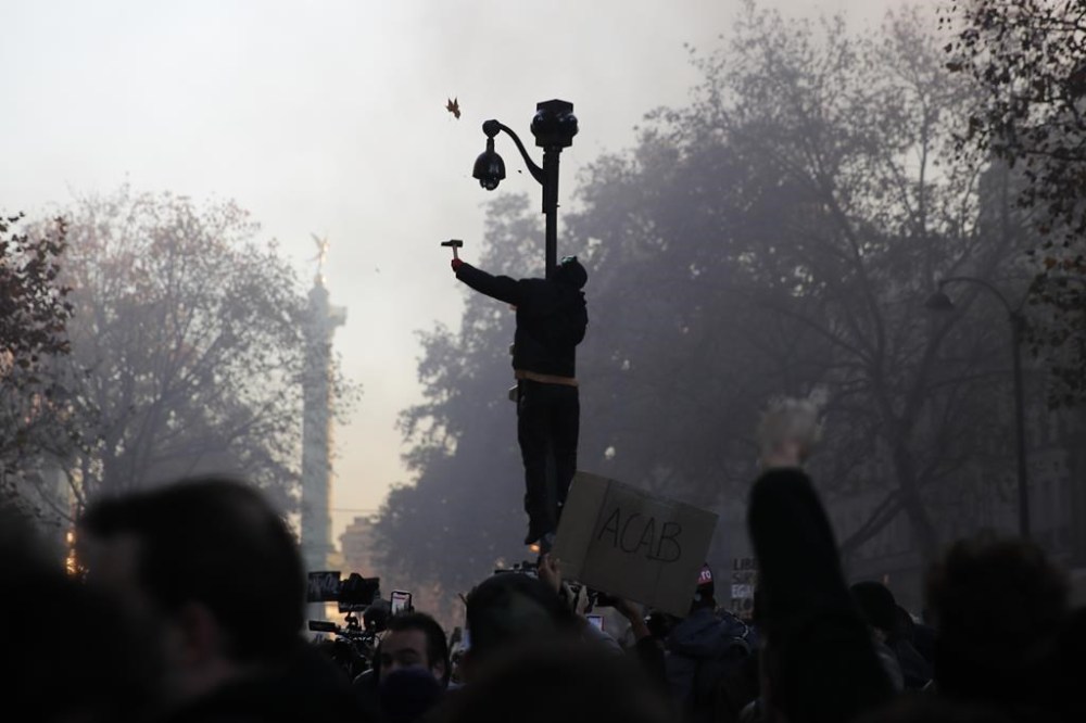 FILE - A protester uses a hammer to break a CCTV camera during a demonstration against a security law that would restrict sharing images of police, Saturday, Nov. 28, 2020 in Paris. A proposed French law for the 2024 Paris Olympics that critics contend will open the door for privacy busting video surveillance technology in France and elsewhere in Europe faces an important hurdle Tuesday March 28, 2023 with lawmakers set to vote on it. The bill would legalize the temporary use of so-called