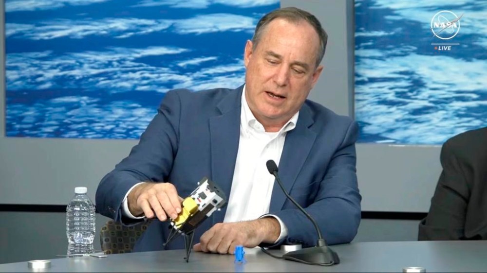 Another experiment, a cube with four cameras, was supposed to pop off 30 seconds before touchdown to capture pictures of Odysseus’ landing. But Embry-Riddle Aeronautical University’s EagleCam was deliberately powered off during the final descent because of the navigation switch and stayed attached to the lander.