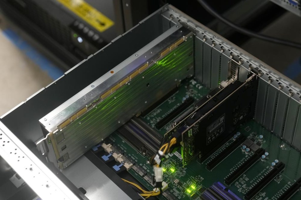 D-Matrix workers were doing final testing on the chips during a recent visit to a laboratory with blue metal desks covered with cables, motherboards and computers, with a cold server room next door.