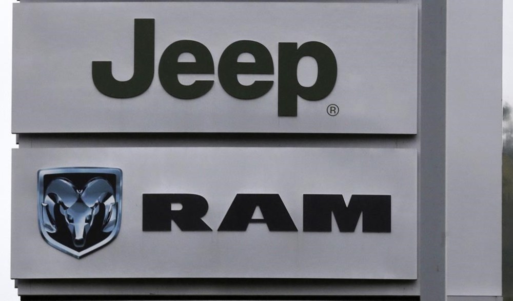 This Oct. 1, 2014 photo shows Jeep and Dodge Ram logos on signs at a dealership in Haverhill, Mass. (AP Photo/Charles Krupa, file)