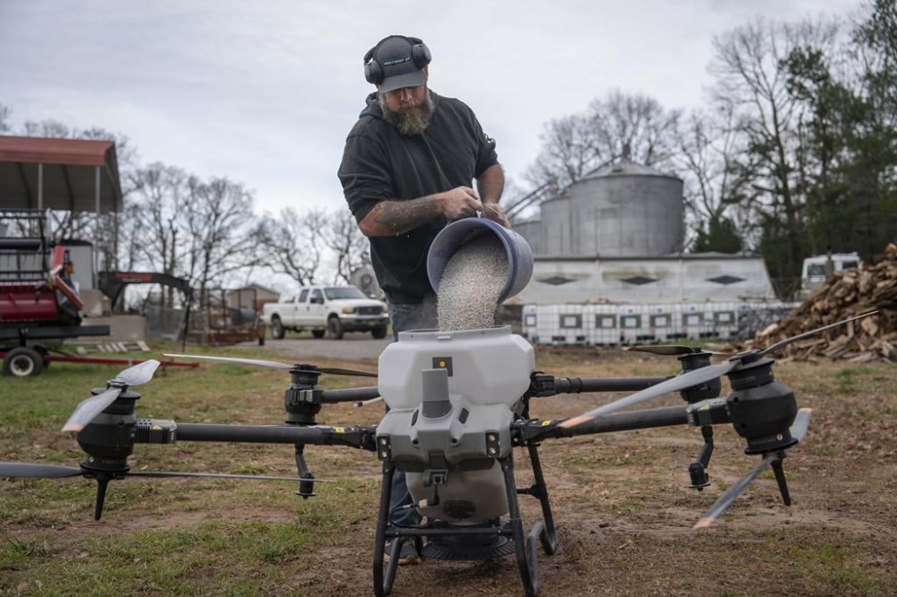 Russell Hedrick, a North Carolina farmer, flies drones to spray fertilizers on his corn, bean and wheat fields at a fraction of what it would cost him to use a conventional ground spreader. A drone spreader costs $35,000, while a ground sprayer would cost $250,000, he said.