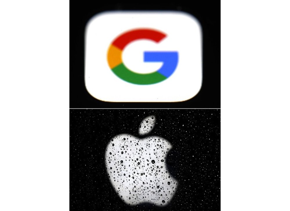 FILE - This combo of photos shows the logo for Google, top, and Apple, bottom, on Wednesday, May 20, 2020 in New York. (AP Photo/File)