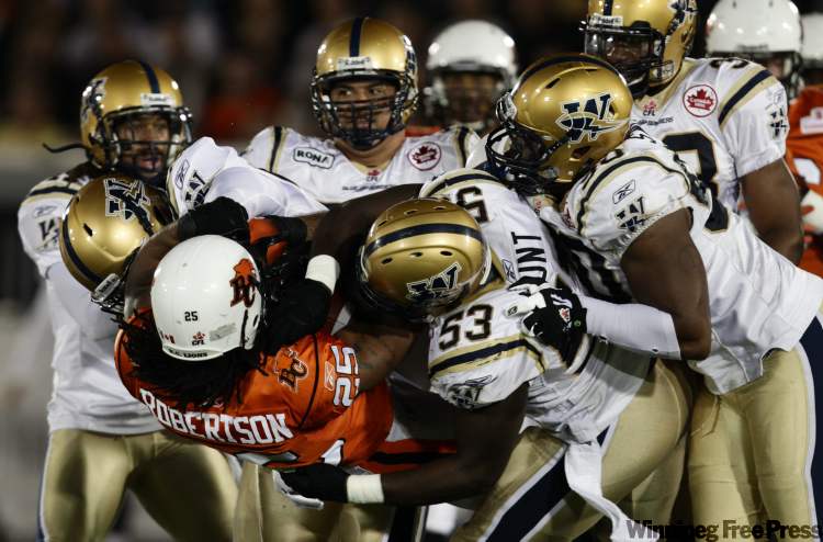 Winnipeg jumped to a 3-0 lead on its first possession when Palardy hit from 17 yards out, that kick coming after Greg Carr dropped a sure TD in the end zone. But the defence set up the next score when Geroy Simon was nailed by Deon Beasley and Jovon Johnson and his ensuing fumble was scooped up by Marcellus Bowman. That set up the only TD of the first half as Jyles connected with Terrence Edwards behind coverage for a 58-yard strike.