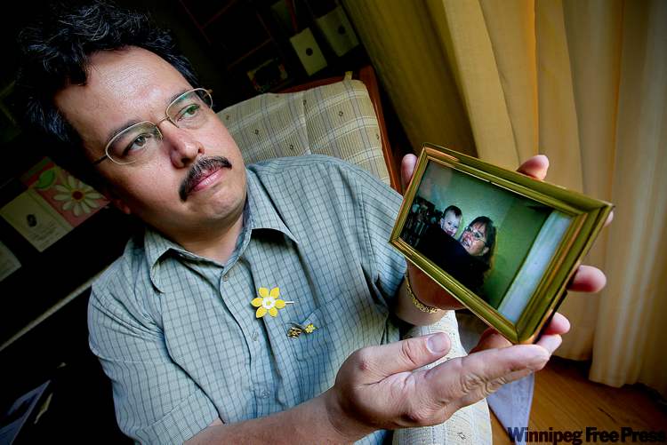 John.Woods @freepress.mb.ca Jeff Cook, a cancer survivor, holds a photo of his sister, Jean, who died of colorectal cancer. She waited six months for a diagnosis and treatment to begin.