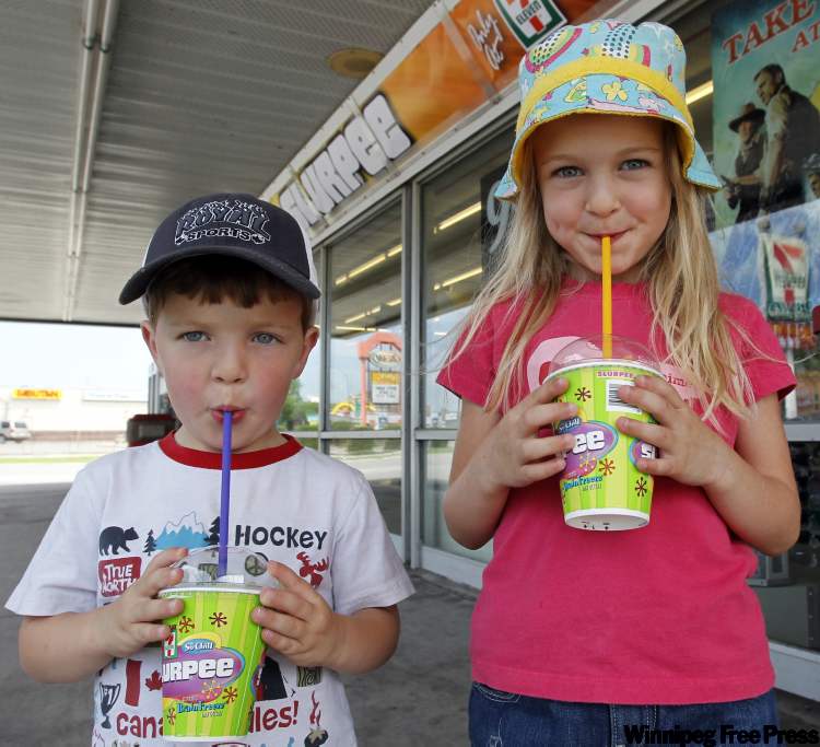 WAYNE GLOWACKI/WINNIPEG FREE PRESS Three-year-old Mason Volkart (left) and his sister Calla, 5, enjoy a Slurpee from the 7-Eleven on Henderson Highway Monday afternoon. Manitoba has once again been crowned the Slurpee Capital of the World, the 12th consecutive year the province has clinched the title.